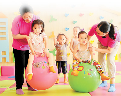 山东省东营市首家社区普惠性托育机构内,教师正带领孩子们做游戏。 |