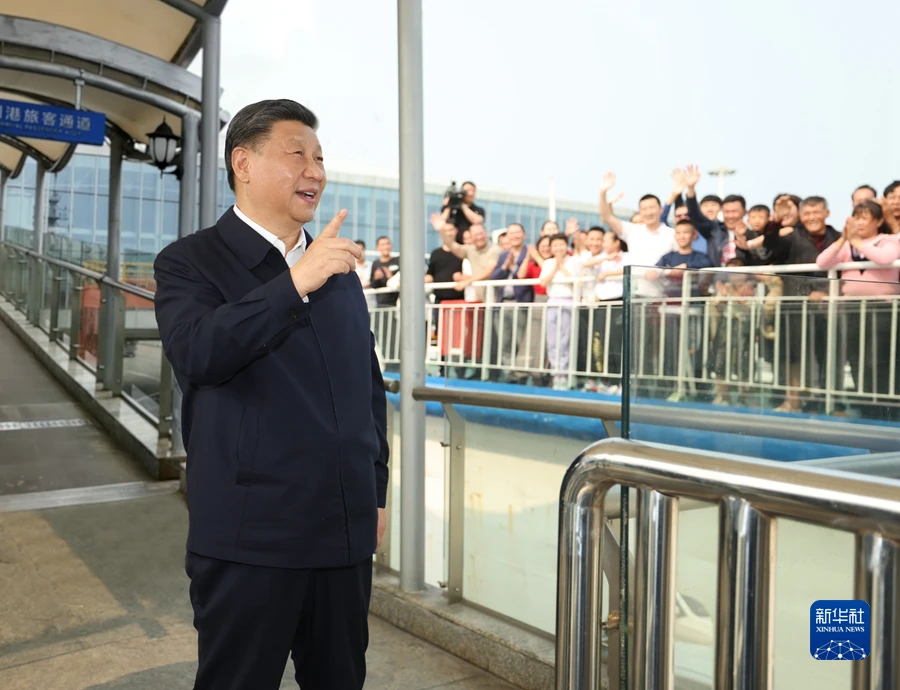 4月10日至13日,中共中央总书记、国家主席、中央军委主席习近平在广东考察。这是10日下午,习近平在湛江市徐闻县徐闻港泊位码头,向船上的旅客挥手致意。新华社记者 燕雁 摄
