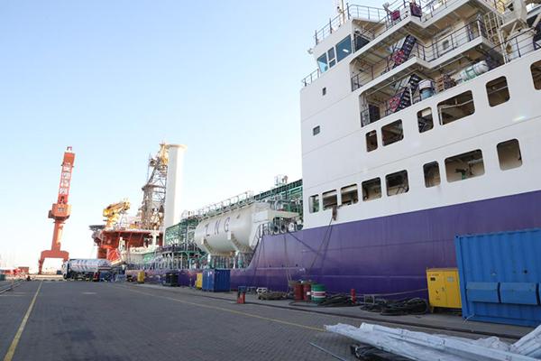 1月2日,大连船舶海洋工程有限公司厂区内码头上,一辆LNG运输卡车正在为“北极探路者”运输船进行保税LNG燃料加注。