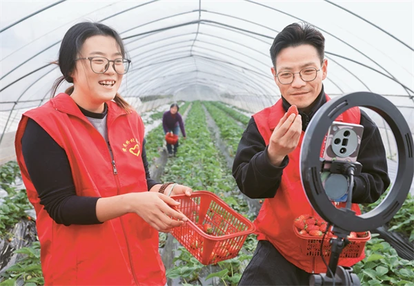 近年来,广大党员、干部在产业转型、科技创新、乡村振兴、民生保障等各领域锐意进取、担当作为,推动经济社会发展不断取得新成效。图为2025年12月4日,党员志愿者在浙江省长兴县和平镇便民桥村蜜甜家庭农场大棚内为种植户直播带货。徐昱 摄