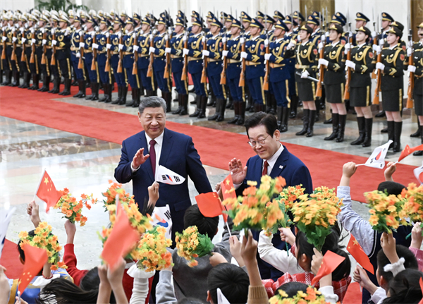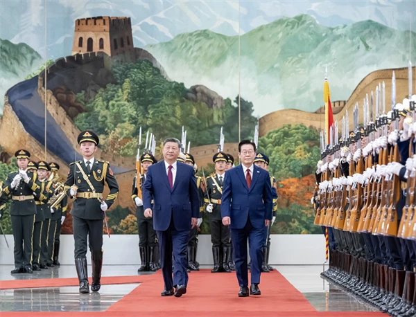 1月5日下午,国家主席习近平在北京人民大会堂同来华进行国事访问的韩国总统李在明举行会谈。这是会谈前,习近平在人民大会堂北大厅为李在明举行欢迎仪式。翟健岚 摄
