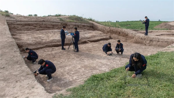 2025年4月30日,敦煌研究院文物工作者在吉尔吉斯斯坦阿克·贝希姆(碎叶城)遗址开展现场保护勘查。金良 摄