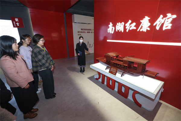 2025年12月11日,在浙江省嘉兴市南湖区红廉馆内,东栅街道文贤社区党员干部开展廉政教育主题党日活动。新华社记者 徐昱 摄