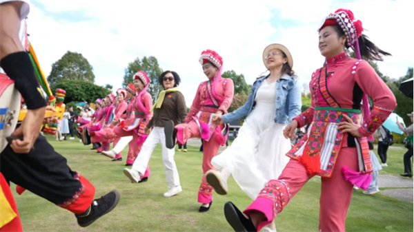太平湖森林公园,游客与当地村民一起打跳。图源:弥勒市融媒体中心