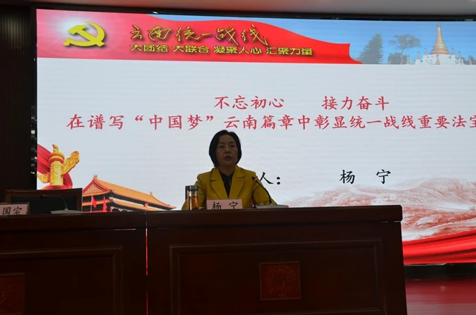 杨宁以《不忘初心 接力奋斗 在谱写“中国梦”云南篇章中彰显统一战线重要法宝作用》为题,从深入学习贯彻习近平新时代中国特色社会主义思想特别是关于统一战线工作的新理念新思想新战略、坚持中国特色社会主义政治发展道路不断巩固团结奋斗的共同思想政治基础、增强做好新时代统战工作能力水平三个方面为全体学员作了专题辅导。