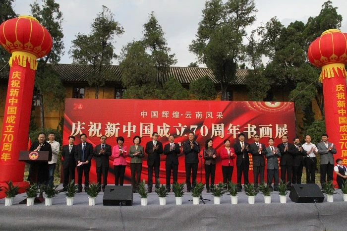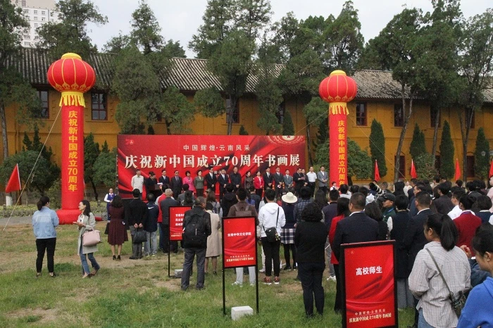 本站讯 9月24日,“中国辉煌·云南风采”——庆祝新中国成立70周年书画展在云南陆军讲武堂开幕。此次书画展由云南中华文化学院、云南省书法家协会共同主办,各民主党派省委及统战团体协办。出席开幕式的有来自省委统战部、省政协、云南中华文化学院、云南省书法家协会、各民主党派省委、省黄埔军校同学会、云南中华职教社、云南文博产业集团等单位领导和参展作者代表。各单位相关干部、2019学习贯彻习近平新时代中国特色社会主义思想专题培训班(第8期)全体学员、云南中华文化学院全体干部职工、省书协部分会员和我省高校相关专业学生等200余人参加开幕式。