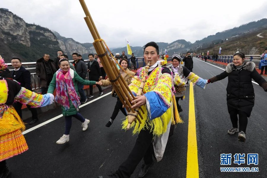 2020年1月21日,四川省叙永县水潦彝族乡的村民载歌载舞,庆祝乌蒙山区川滇黔交界处鸡鸣三省大桥通车。新华社记者 江宏景 摄
