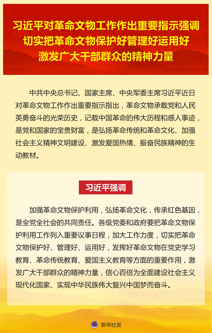 习近平强调,加强革命文物保护利用,弘扬革命文化,传承红色基因,是全党全社会的共同责任。各级党委和政府要把革命文物保护利用工作列入重要议事日程,加大工作力度,切实把革命文物保护好、管理好、运用好,发挥好革命文物在党史学习教育、革命传统教育、爱国主义教育等方面的重要作用,激发广大干部群众的精神力量,信心百倍为全面建设社会主义现代化国家、实现中华民族伟大复兴中国梦而奋斗。