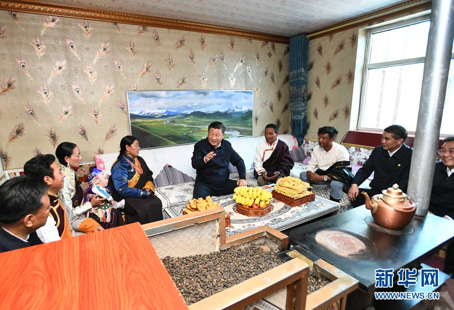 沙柳河镇果洛藏贡麻村是牧民集中安置新村,2017年依托牛羊养殖业等产业实现整村脱贫。习近平来到这里,藏族牧民索南才让率一家老小热情邀请总书记到家里做客,并献上哈达。习近平走进家中,屋里屋外仔细察看,并同一家人围坐在客厅聊家常。索南才让激动地说,牧民生活好,全靠党的政策好,衷心感谢共产党,衷心感谢总书记。习近平指出,今年是中国共产党成立一百周年,我们党发展壮大起来不容易,夺取政权不容易,建设新中国不容易。老百姓衷心拥护中国共产党,就是因为中国共产党始终全心全意为人民服务、为各民族谋幸福。