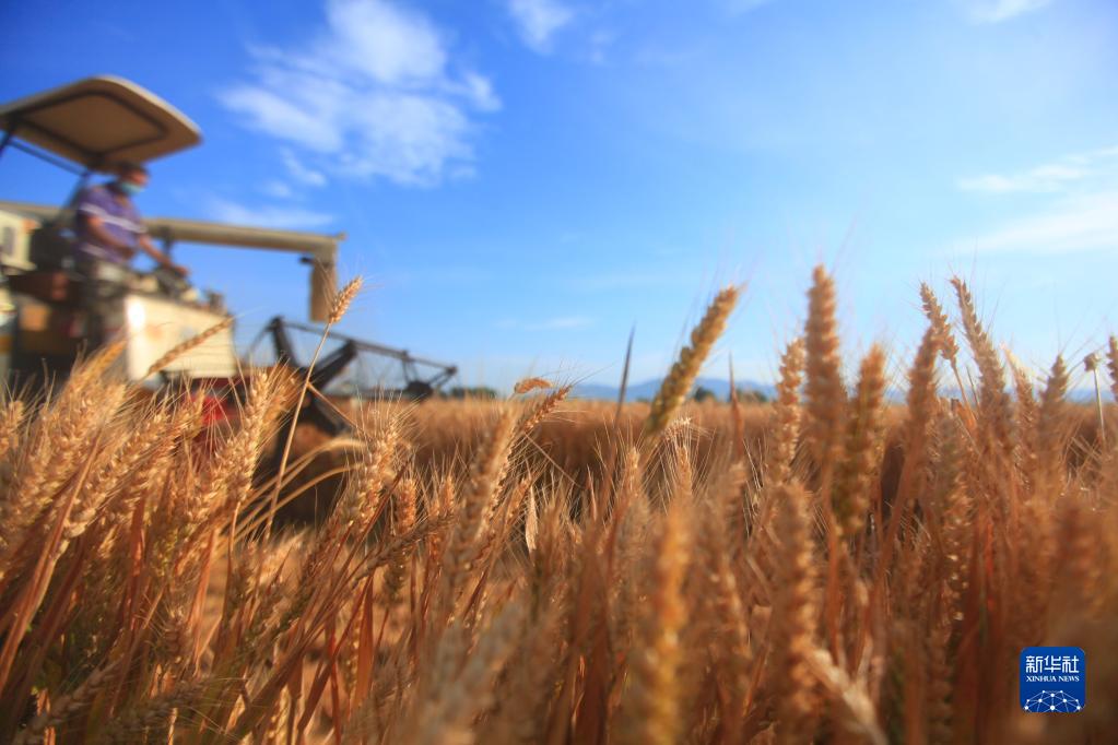 6月8日,收割机在山东省临沂市平邑县的麦田里收割小麦。新华社发(武纪全 摄)