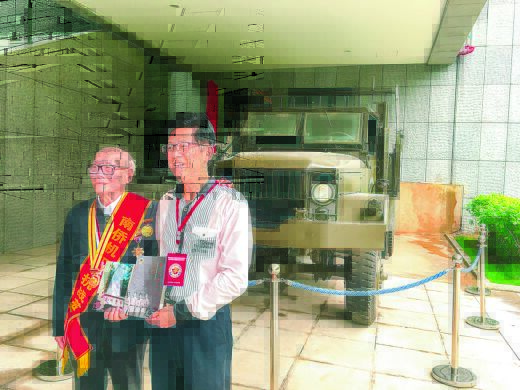 林少川与蒋印生(左)合影,身后是南侨机工回国抗日纪念馆珍藏的抗战运输车辆。受访者供图