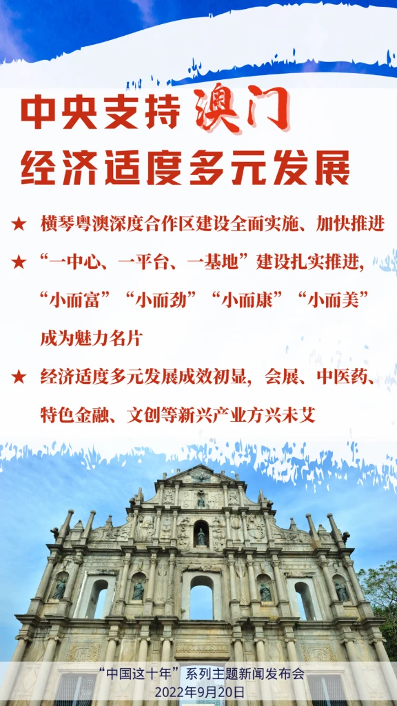 十年来,澳门“一中心、一平台、一基地”建设扎实推进,经济适度多元发展成效初显。“小而富”“小而劲”“小而康”“小而美”成为澳门的魅力名片。澳门经济快速发展,人均地区生产总值进入世界前列。会展、中医药、特色金融、文创等新兴产业方兴未艾,在澳门本地生产总值中占比持续上升。