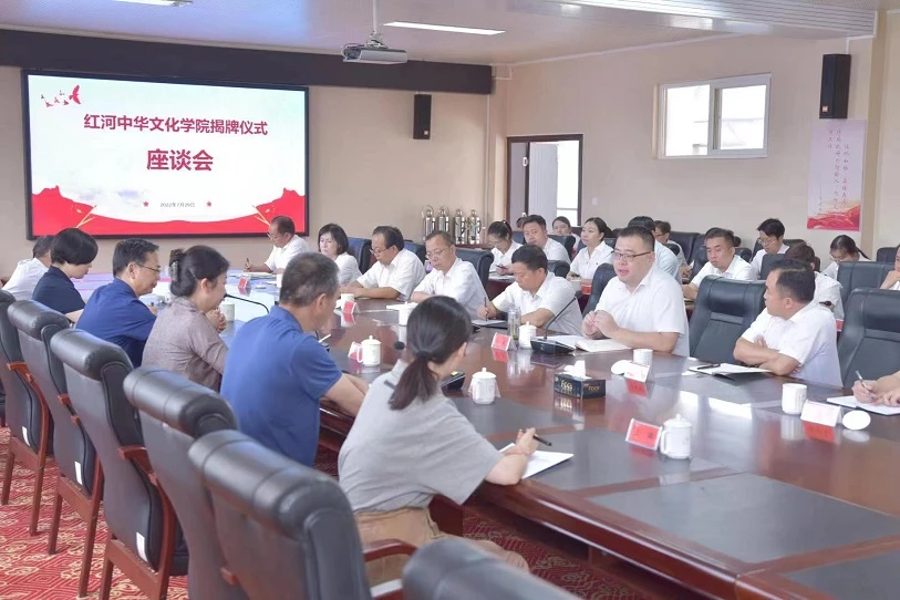 何云葵和朱毅共同为“红河中华文化学院”揭牌。揭牌仪式后,召开了座谈会。何云葵对红河中华文化学院揭牌表示热烈的祝贺。她强调,红河州社院加挂红河中华文化学院牌子,是省社会主义学院和红河州共同推动习近平新时代中国特色社会主义思想在红河大地落地生根的重大举措和重要实践,是红河州社院深入贯彻落实《社会主义学院工作条例》及省委印发《贯彻<社会主义学院工作条例>实施细则》的具体行动。今后要坚持以《条例》和《实施细则》为遵循,在努力推动中华文化教育、研究和对外交流方面为全省其他州(市)社院(校)作示范,出经验,擦亮中华文化学院这块“金字招牌”。对红河中华文化学院今后的工作,她提出三点希望:一要坚持“社院姓社”,努力把红河中华文化学院打造成学习宣传贯彻习近平新时代中国特色社会主义思想的政治高地;二要突出红河特色,努力把红河中华文化学院打造成开展中华文化教育、研究、对外交流的文化阵地;三要注重联谊交友,努力把红河中华文化学院打造成面向南亚东南亚的交流园地。与会同志就今后如何支持并开展好红河中华文化学院工作进行了深入交流。