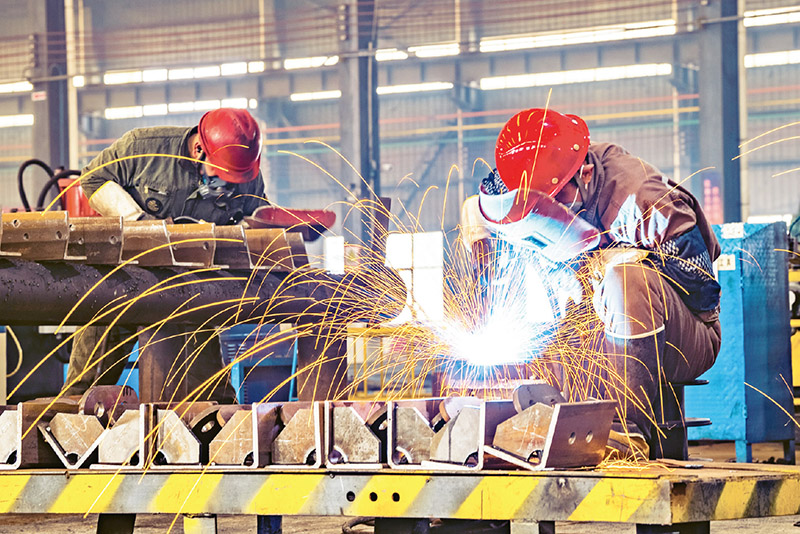 就业是最基本的民生。民营企业是吸纳就业的“蓄水池”和“稳定器”,充分挖掘民营企业就业潜力对缓解就业市场压力有重要作用。图为2023年1月6日,河南省一家民营企业的工人正在焊接“武汉—南昌特高压钢管塔”项目订单组装件。 人民图片 赵永涛/摄
