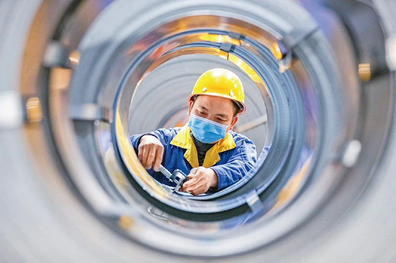 民营经济作为社会主义市场经济的重要组成部分,在扩大就业、改善民生、促进创业创新方面承担着重要角色,是促进经济增长、实现经济稳定运行的重要力量。图为2023年1月1日,浙江省湖州市德清县雷甸镇的一家民营企业生产车间里,工人们正加紧赶制一批高精度特种钢带订单,全力冲刺新年“开门红”。 人民图片 王树成/摄