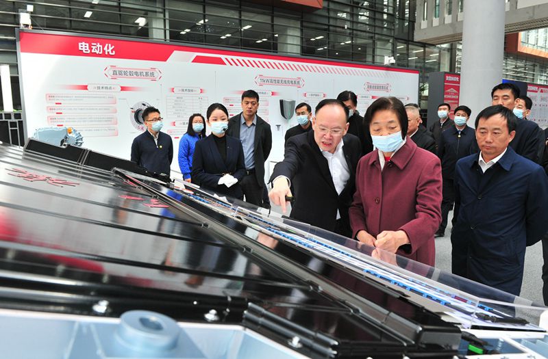 调研组一行详细了解一汽在智能网联、节能降耗等方面的创新成果。企业相关负责人介绍,近年来,一汽坚持以创新驱动为主线,全力推动红旗品牌数智化转型,2019年至2021年累计突破关键核心技术300余项,今年一季度累计出口整车1.5万辆,同比增长125%。
