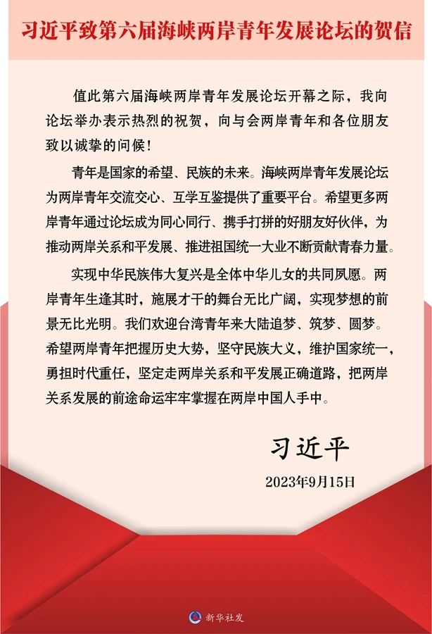 新华社北京9月15日电 中共中央总书记、国家主席习近平15日向第六届海峡两岸青年发展论坛致贺信。