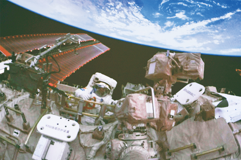 图为2024年7月3日在北京航天飞行控制中心拍摄的神舟十八号航天员李聪出舱的画面。 新华社记者 郭中正/摄