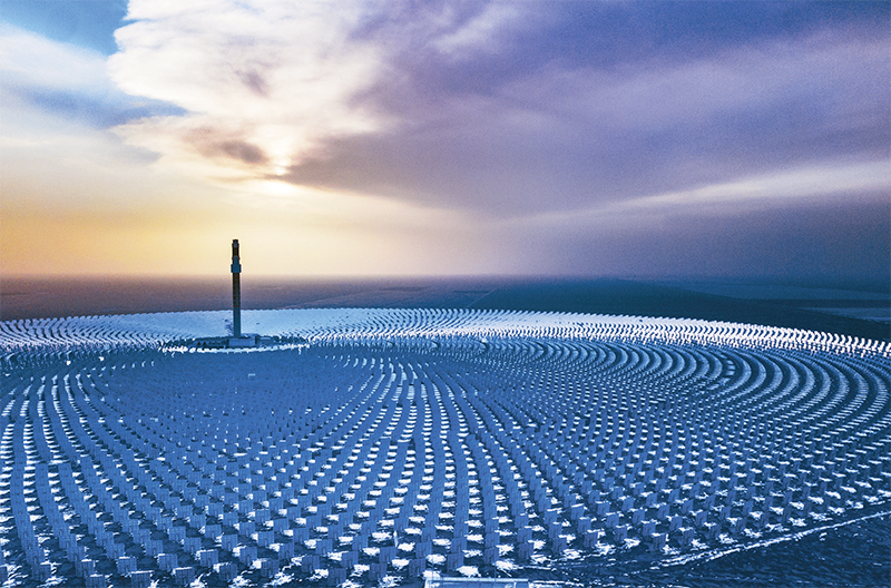 图为2024年2月26日,在茫茫雪地里持续吸光发热的首航敦煌100兆瓦熔盐塔式光热发电站。 人民图片 王斌银/摄
