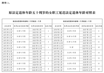 3.原法定退休年龄五十周岁的女职工延迟法定退休年龄对照表