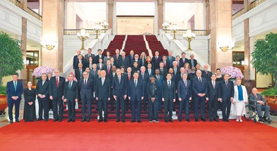 10月11日上午,国家主席习近平在北京人民大会堂集体会见出席中国国际友好大会暨中国人民对外友好协会成立70周年纪念活动的外方嘉宾。这是习近平同部分外方嘉宾代表合影留念。