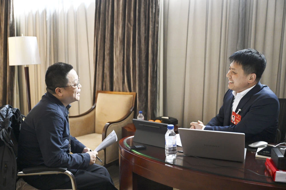 3月7日,舒勇委员在全国政协十四届二次会议第二场“委员通道”集体采访活动上接受媒体采访。新华社记者 李贺 摄