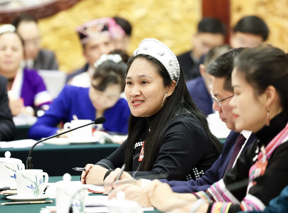3月5日,李瑞芳代表在十四届全国人大二次会议云南代表团全体会议上发言。新华社记者 刘卫兵 摄