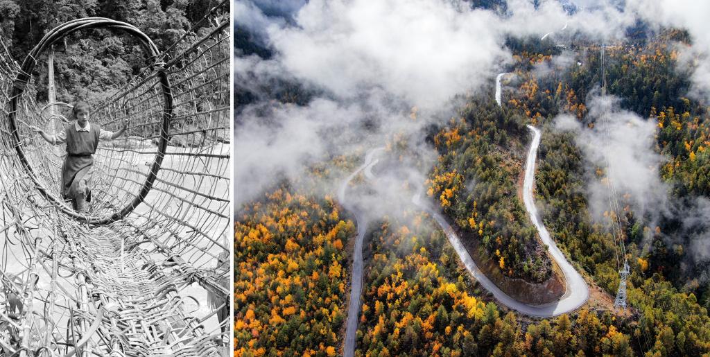 拼版照片:左图是墨脱县雅鲁藏布江上的藤桥(20世纪80年代资料照片,新华社记者 顾绶康 摄);右图是2020年11月5日拍摄的派墨公路米林段公路。新华社发