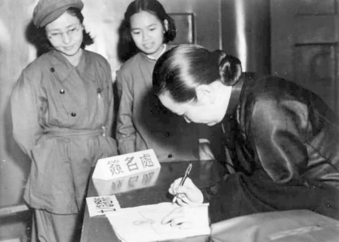 图为宋庆龄在中国人民政治协商会议第一届全体会议签名处签到,她是唯一一位使用钢笔签到的代表。