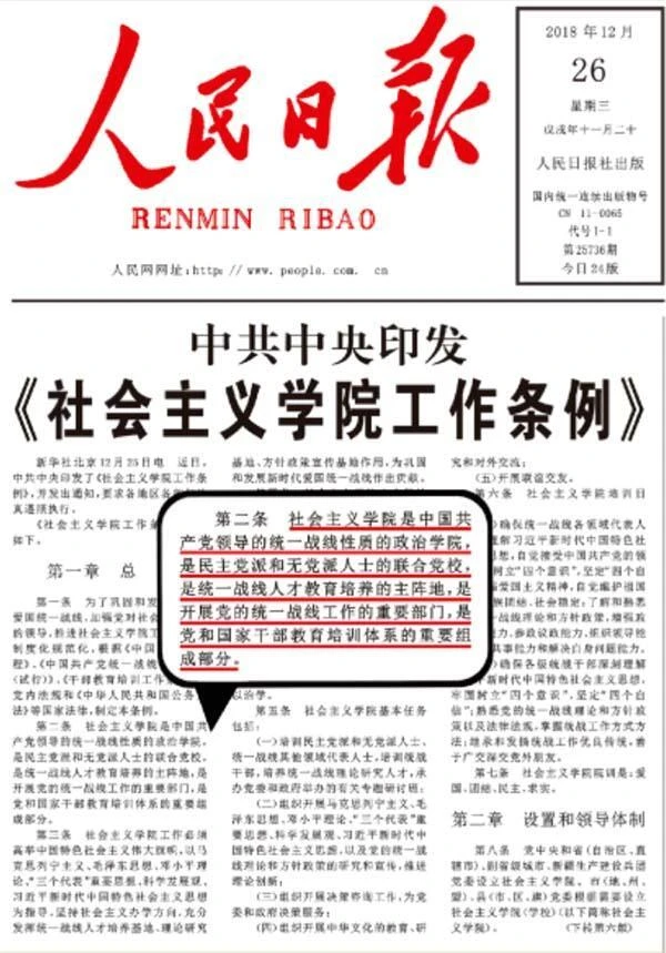 2018年12月,党中央印发《社会主义学院工作条例》,这是第一部由党中央制定的关于社会主义学院工作的党内法规,为提高新时代社院工作的科学化、制度化、规范化水平发挥了重要作用。
