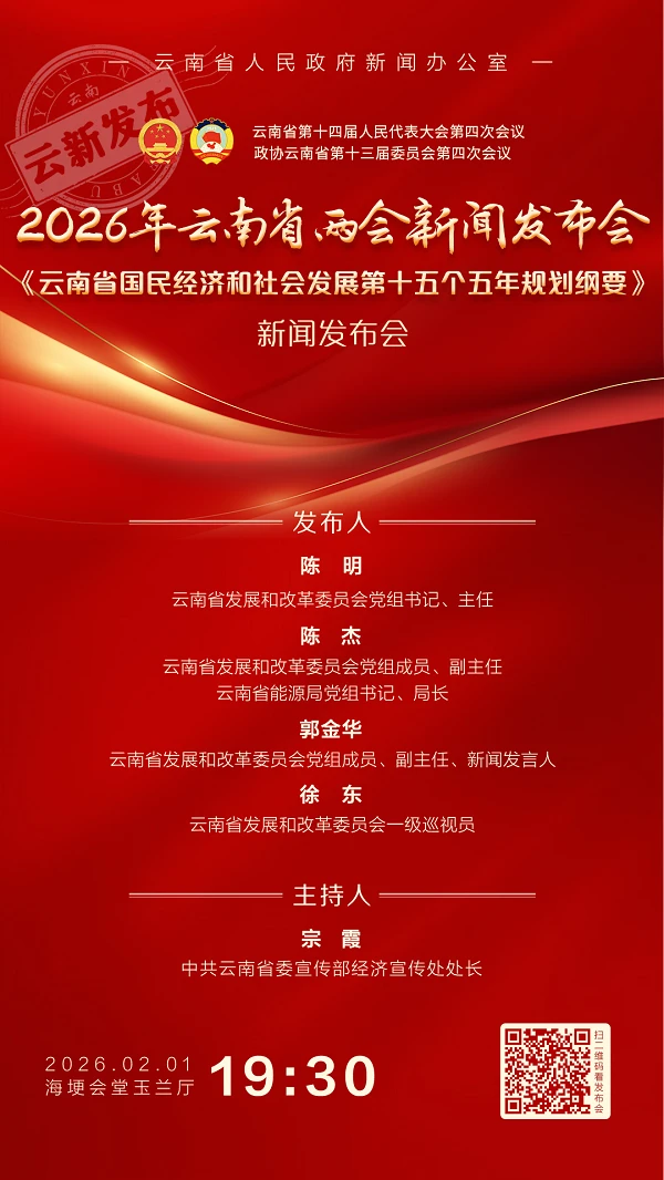 2月1日,云南省人民政府新闻办公室在云南海埂会堂举行2026年云南省两会新闻发布会第五场:《云南省国民经济和社会发展第十五个五年规划纲要》新闻发布会,省发展改革委介绍相关情况并回答记者提问。