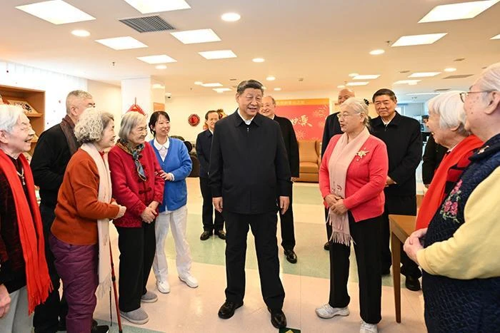 在银龄老年公寓,习近平详细了解老年人健康检查、康复训练、日常起居照料等情况。大厅里,一些老人正在写春联和福字,习近平来到他们中间,欣赏他们的创作,勉励他们老骥伏枥、老有所为,祝他们健康长寿、春节快乐。