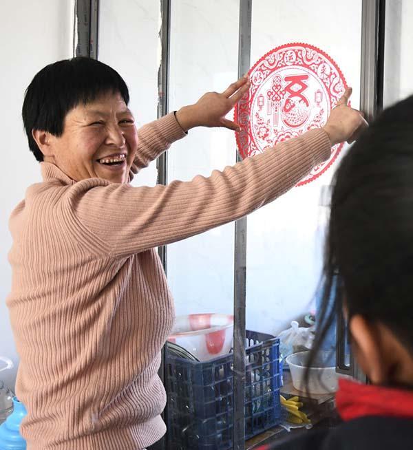 在甘肃省临夏回族自治州积石山保安族东乡族撒拉族自治县吹麻滩镇林坪村集中安置点,村民王福玲在张贴新年饰品(2024年12月31日摄)。新华社发(史有东 摄)