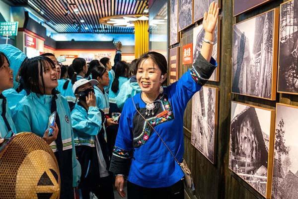 在湖南湘西十八洞村,讲解员施艳琴为游客讲解十八洞村的故事(2023年11月1日摄)。新华社记者 陈思汗 摄