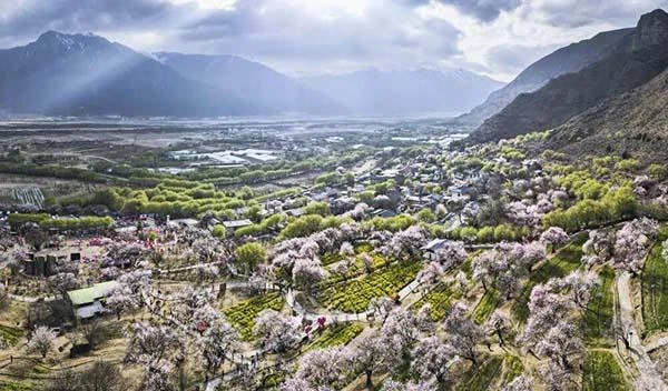 这是在西藏林芝市巴宜区嘎拉村拍摄的桃花(2025年3月29日摄,无人机全景照片)。新华社记者 齐芷玥 摄