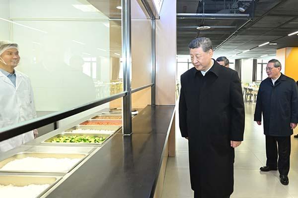 在学校食堂,习近平察看就餐环境、菜品种类等,叮嘱一定要确保学生饮食的安全和营养。离开学校时,师生们一齐向总书记问好,习近平勉励孩子们惜福奋进、积极向上,与雄安新区一起成长,与中国式现代化同步发展。