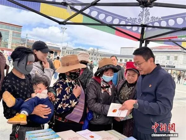 2026年4月18日,青海省果洛藏族自治州“传承五四精神、共筑美丽果洛”五四青年节系列活动热闹启幕。图为工作人员向驻足的各族青年和民众解读《中华人民共和国民族团结进步促进法》。祁绣娟 摄