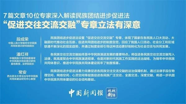 西北政法大学法治与中华民族共同体建设研究中心教授常安表示,各族群众在社会生活中紧密联系的广度和深度前所未有,民族地区的经济社会发展与全国其他地区的联系也不断加深。民族团结进步促进法着力完善促进各民族交往交流交融的法治保障机制,通过法律手段在物理空间、网络空间、心灵空间等层面促进各民族广泛交往、全面交流、深度交融,将进一步巩固中华民族共同体建设的社会结构基础。