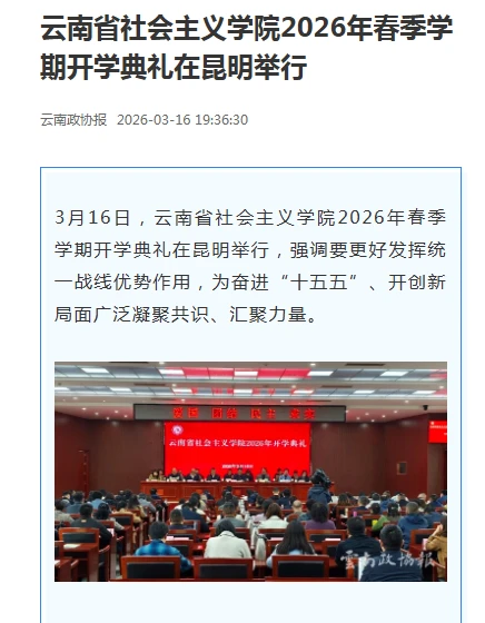 3月16日,云南省社会主义学院2026年春季学期开学典礼在昆明举行。会议强调要更好发挥统一战线优势作用,为奋进“十五五”、开创新局面广泛凝聚共识、汇聚力量。